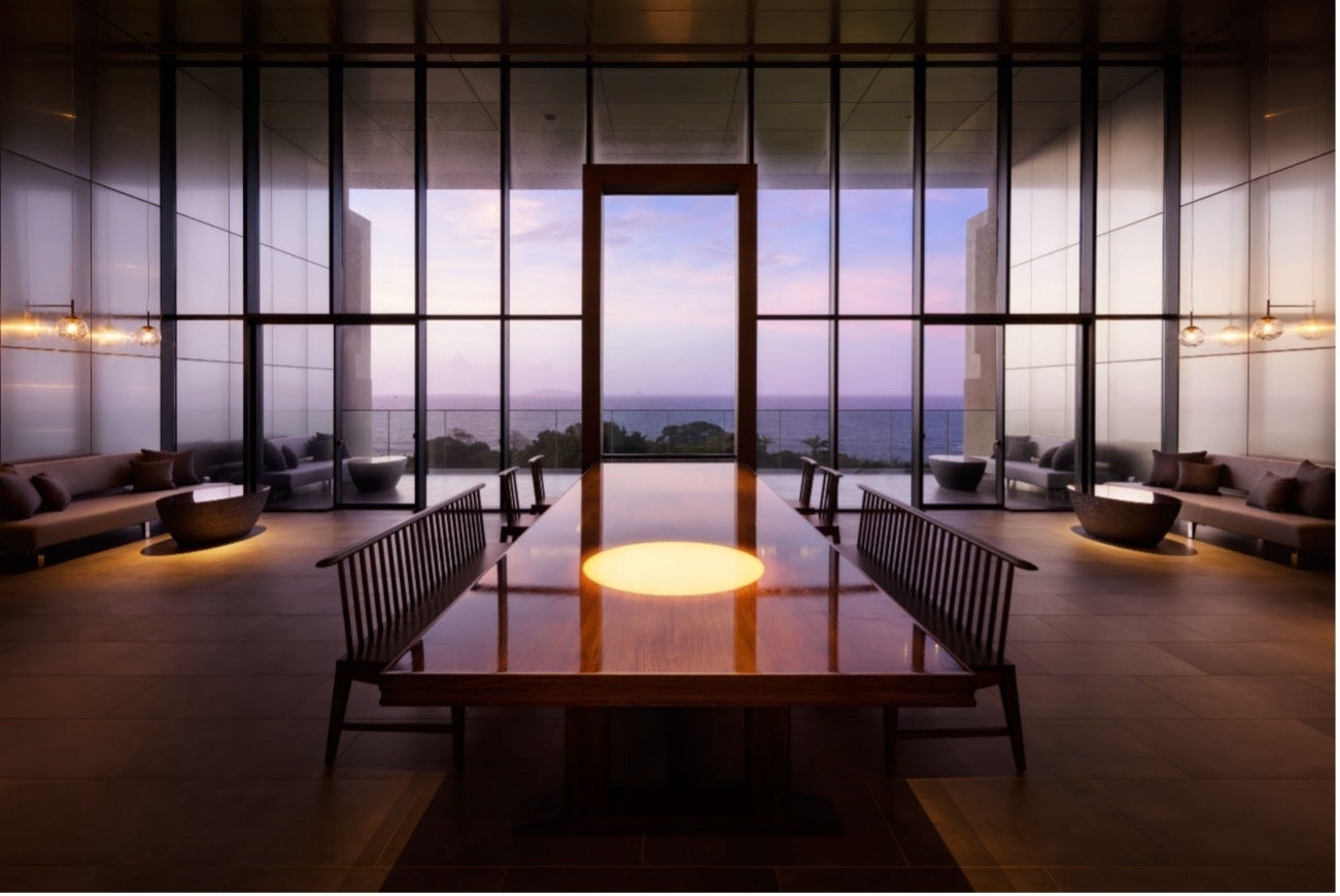 内装設計とデザインを手がけた橋本夕紀夫氏がテーマに掲げたのは「The view」。どこまでも続く美しい海景、身体を包み込む海風。鐙瀬ならではのダイナミックで雄大な自然が主役となるようなデザインが、館内にちりばめられています。