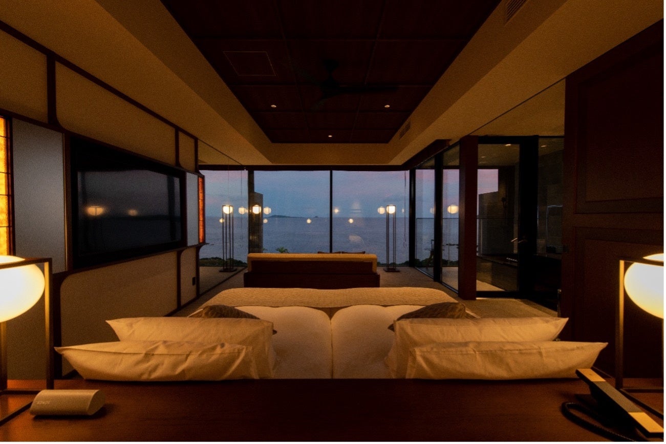 全26室、水平線に包まれるかのような、パノラミック・オーシャンビューとなっており、客室露天風呂では潮風や波音を感じられます。また、テラス部分を水盤にした水面に反射した ”光” が天井に移り、幻想的な雰囲気に包まれます。