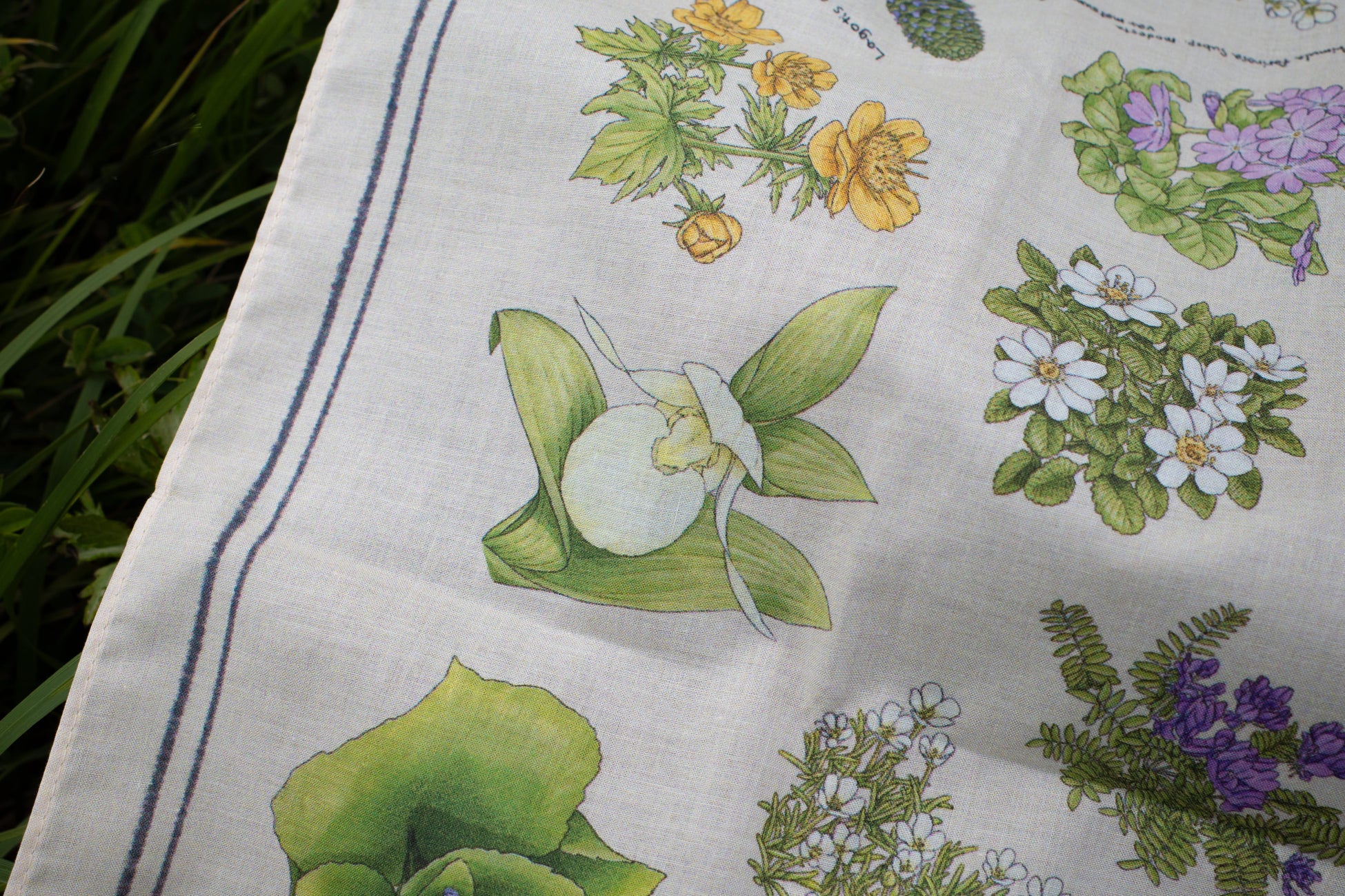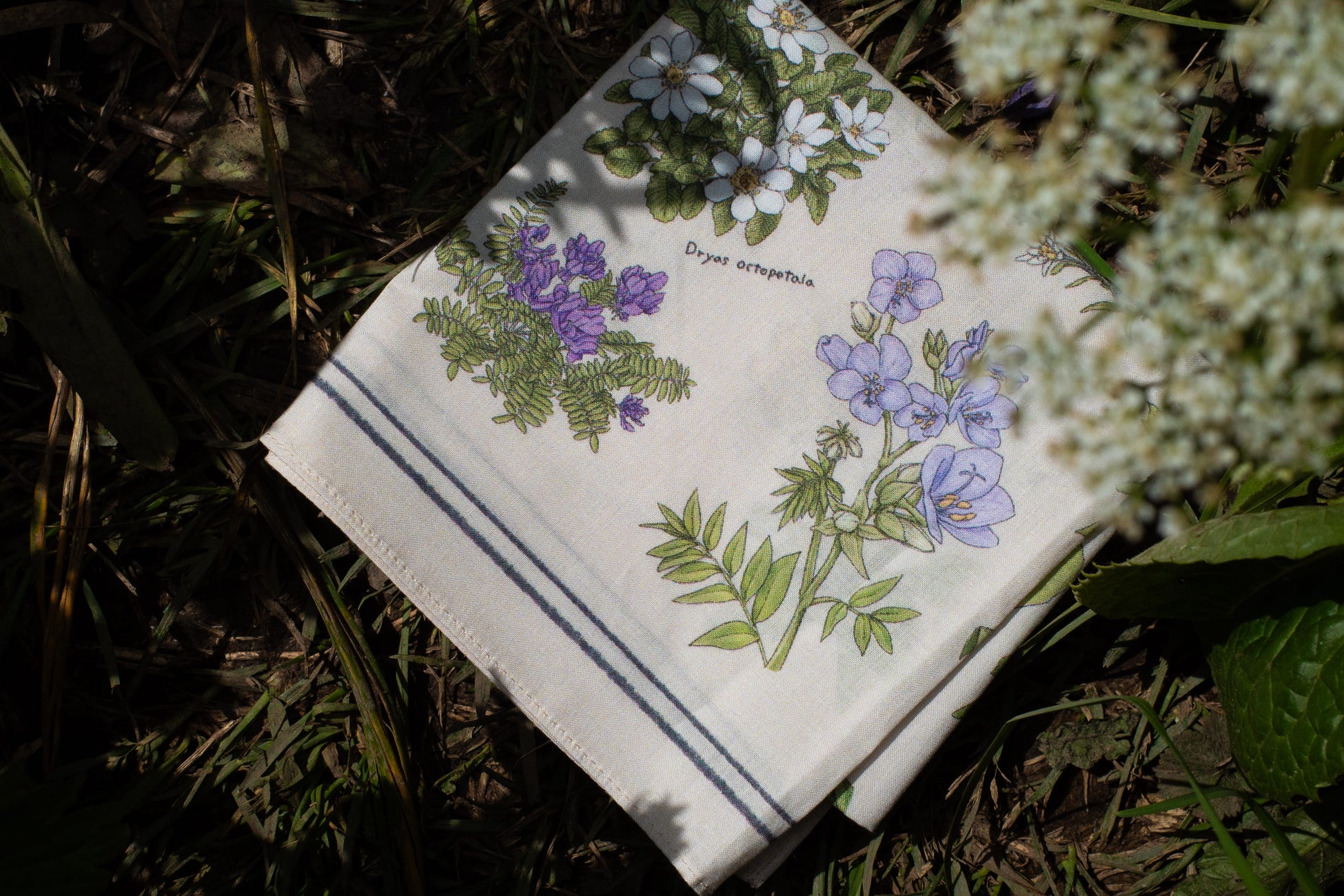 今回のハンカチでは、長年守り続けられてきた礼文島固有の植物たちを古書に出てくるようなタッチで描かせていただき、天地など向きは作らず、生成りの布の上に礼文島の植物たちをばらっと並べたような雰囲気で描かせていただきました。