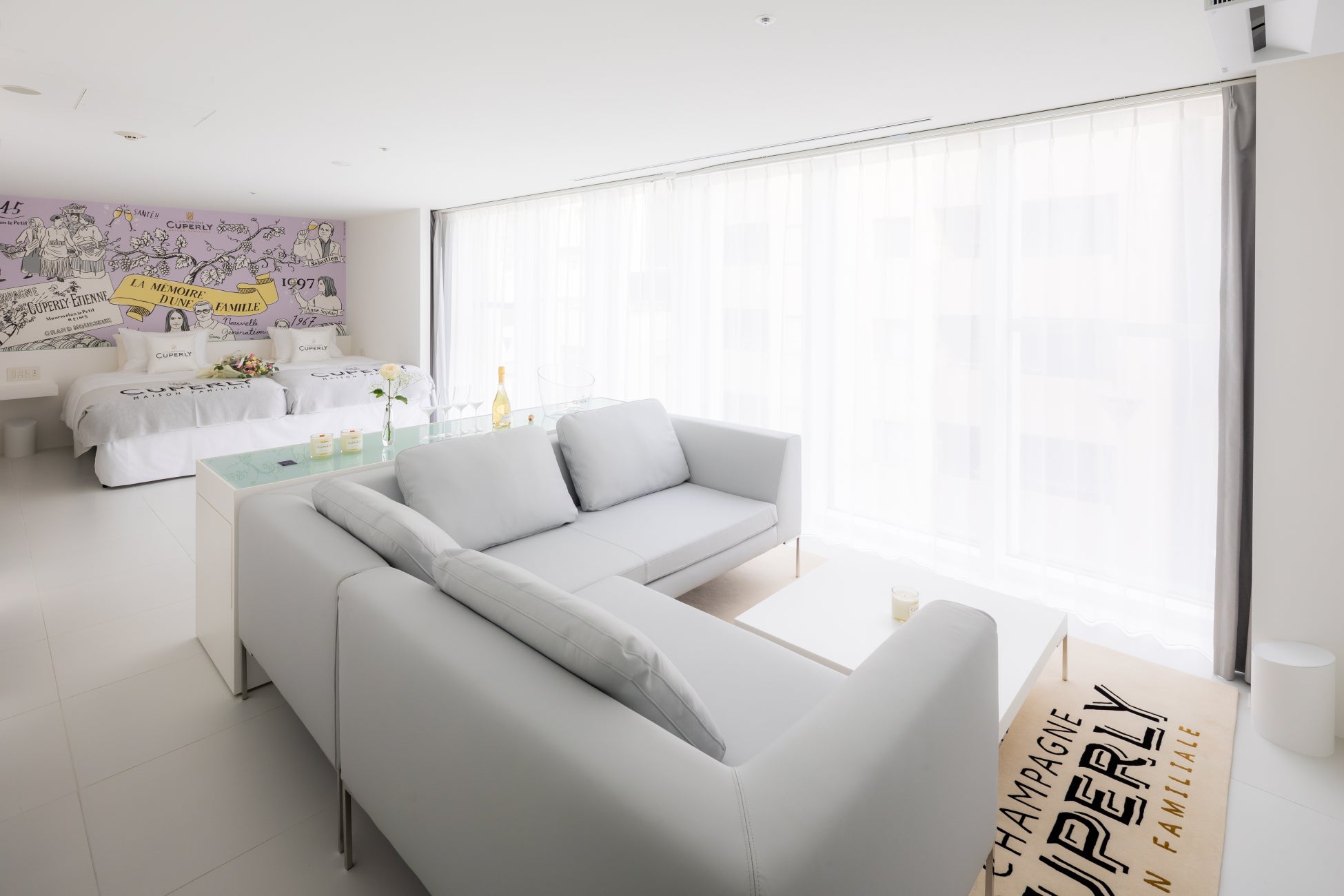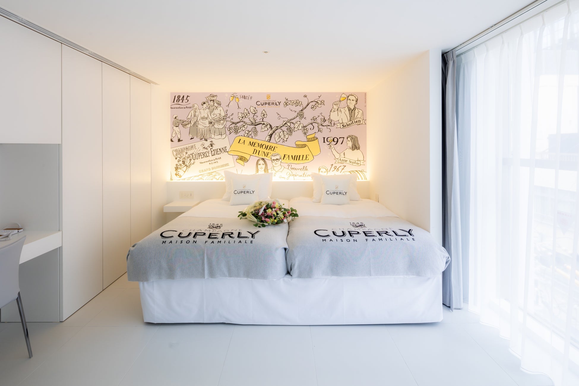 また、「キュペルリールーム」では、「ブラン・ド・ブラン グラン・クリュ」をはじめとしたキュペルリーが誇るキュヴェのラインナップのほか(※)、イラストレーターMayumi Mori氏によるメゾンの歴史が伝わるファミリーツリーをデザインしたヘッドボードと、そしてここでしか出会えない生産者直筆のメッセージやメッセージ動画をお愉しみいただけます。(※公式サイトから「シャンパーニュ付きプラン」をご予約の場合に限り、1回のご宿泊につき1本ご用意しております)