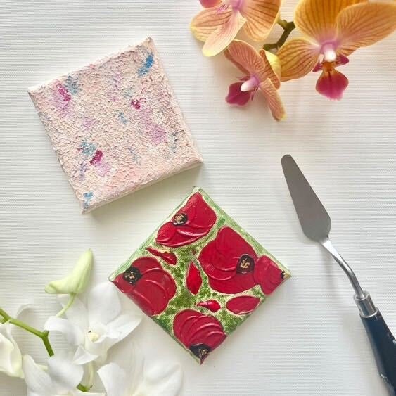 テクスチャーアートは、パテやモデリング材などを使って“質感”を感じる新感覚アートです。立体感のある作品が特徴で、視覚だけでなく触覚も楽しむことができます。今回のワークショップでは、7cm×7cmミニキャンバスに自由に素材を重ね、心のおもむくままに作品をつくりあげます。