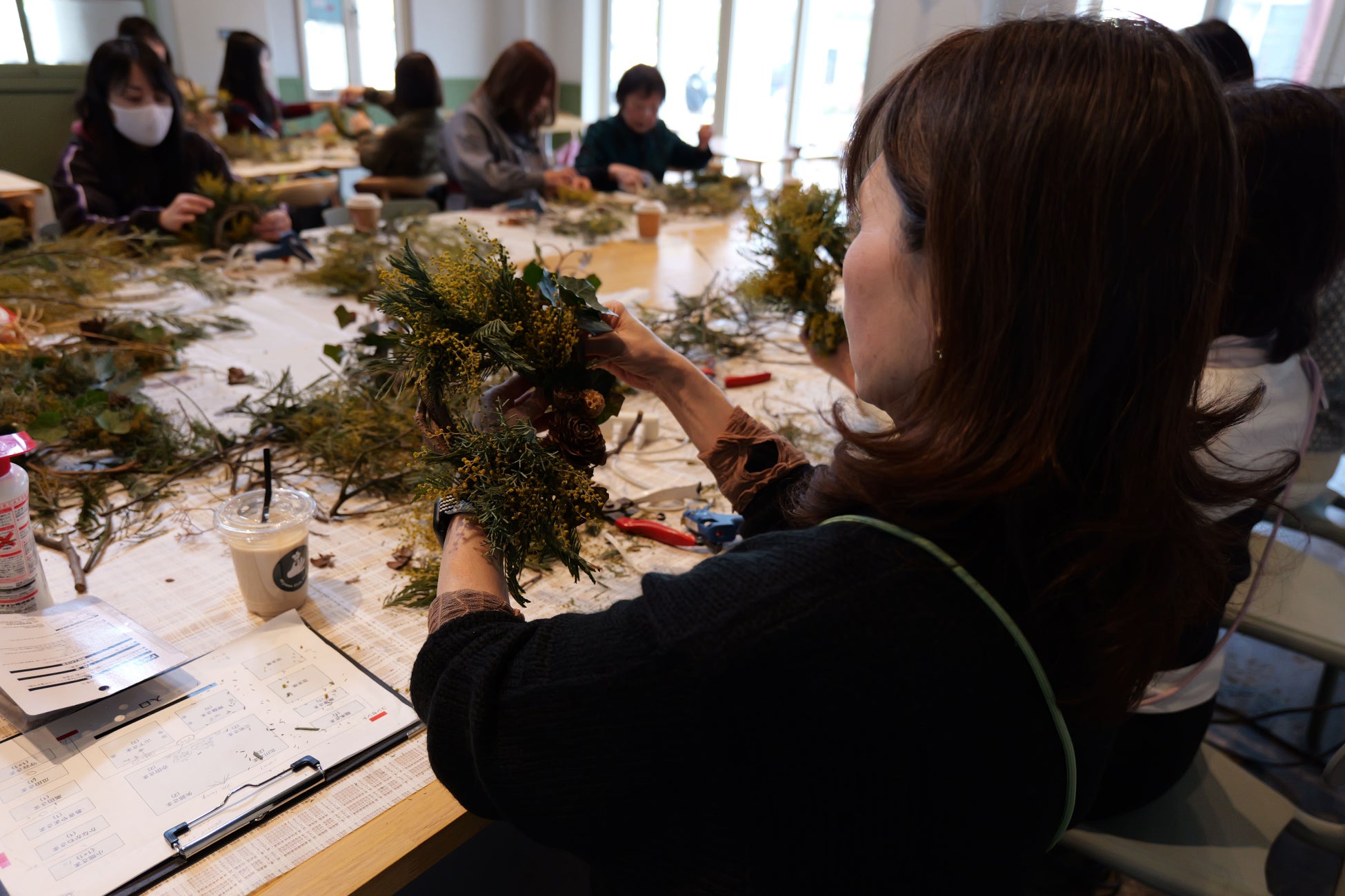 2025年3月に開催した「ミモザリースづくりワークショップ」では、親子連れやお孫さまと一緒に参加された方など、幅広い年代のお客さまにご参加いただきました。