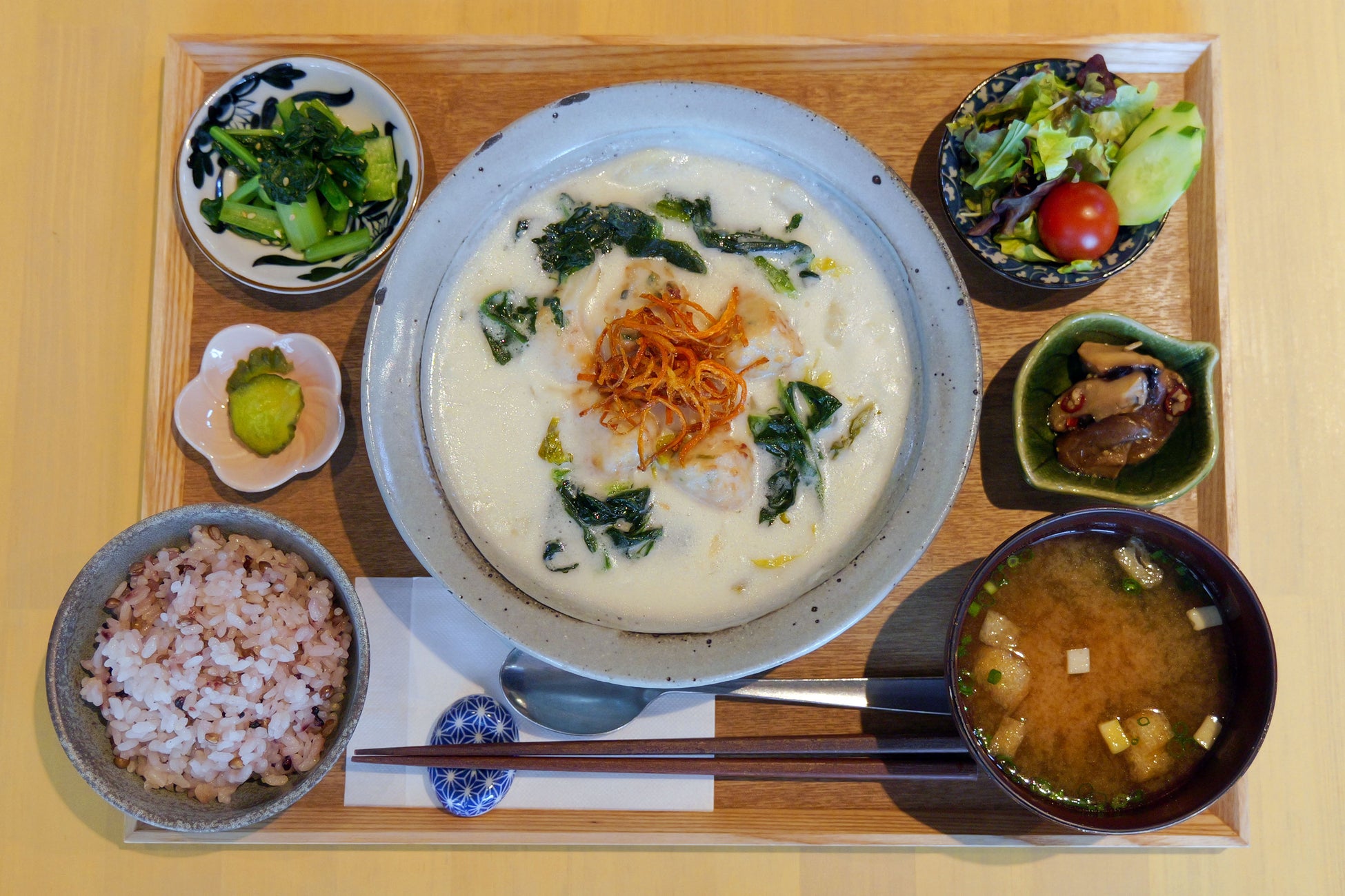 冬が旬で玉野市の近海で獲れた真鯛を使ったつみれと、地元玉野市で栽培されて、道の駅でも販売している白菜やほうれん草の地野菜を使った冬の時期にぴったりなクリーム煮込みです。