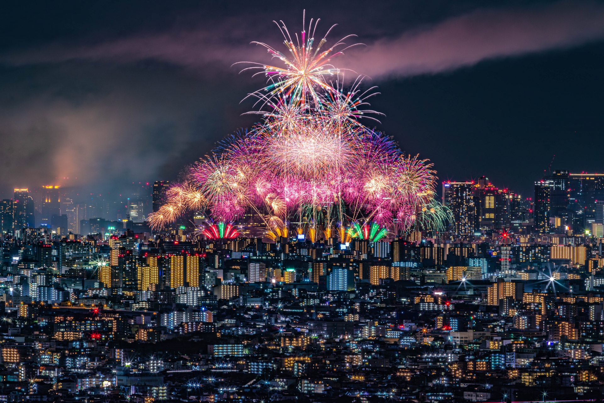 大阪の街並みと花火が織りなす光景は、ここでしか見られない迫力です。