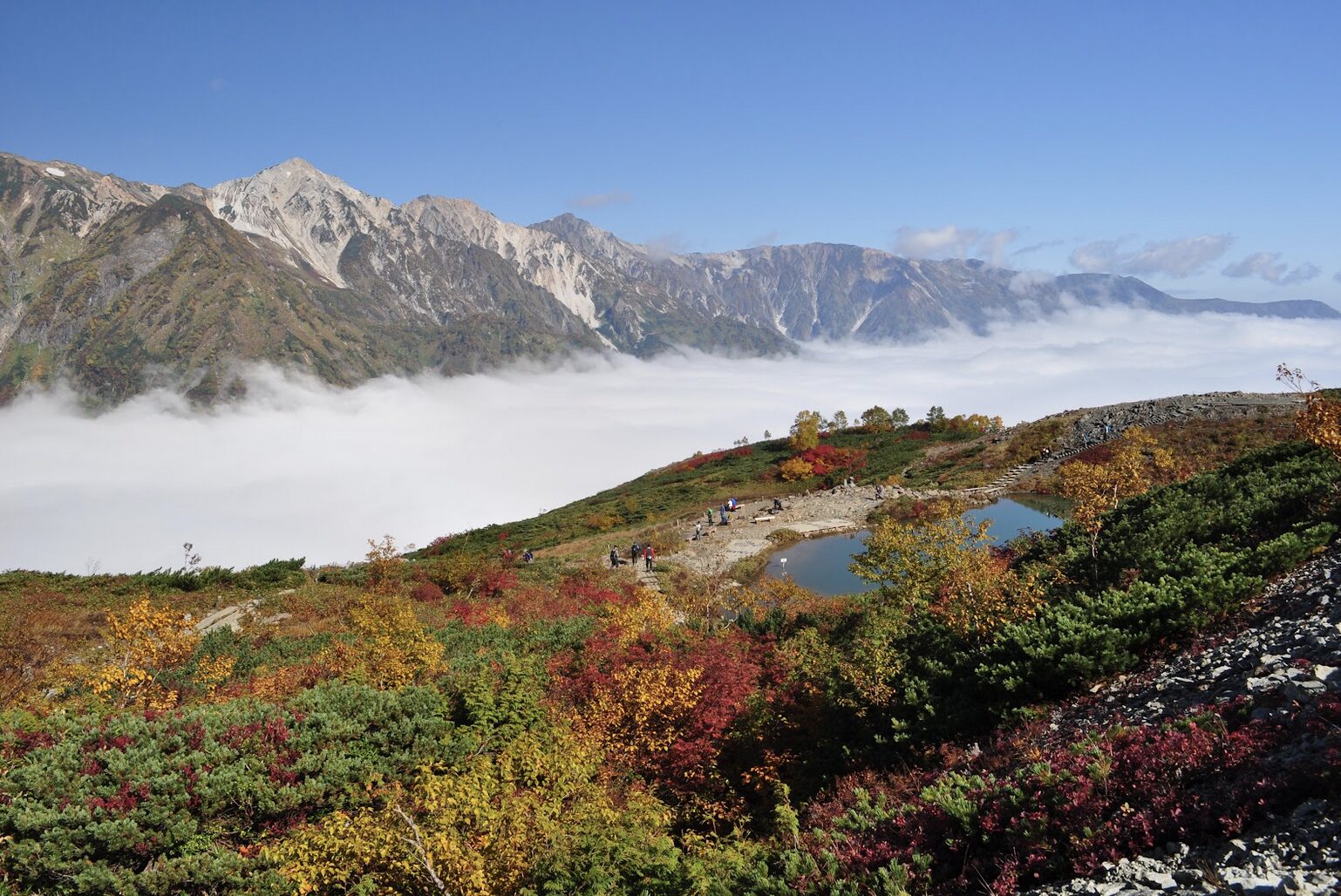 標高差により雪・紅葉・緑の山が同時に見られる”三段紅葉”の景色を9~11月の長期間楽しめるのも、白馬ならではの魅力です。