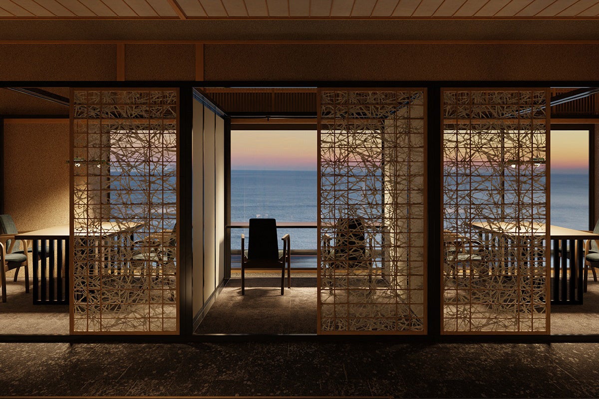 “伊豆の記憶を呼び覚ます、海と時の和食”をテーマに、伊豆の食材や生産者の想いを丁寧に紡ぎ、懐かしさと新しさを織り交ぜた料理をご用意。和食とワインのマリアージュにより、伊豆の食材の新たな楽しみ方を提案します。旧宴会場をリノベーションしたレストランには半個室席も備え、プライベート空間を演出。絶景を眺めながら大切な人との語らいをお楽しみください。