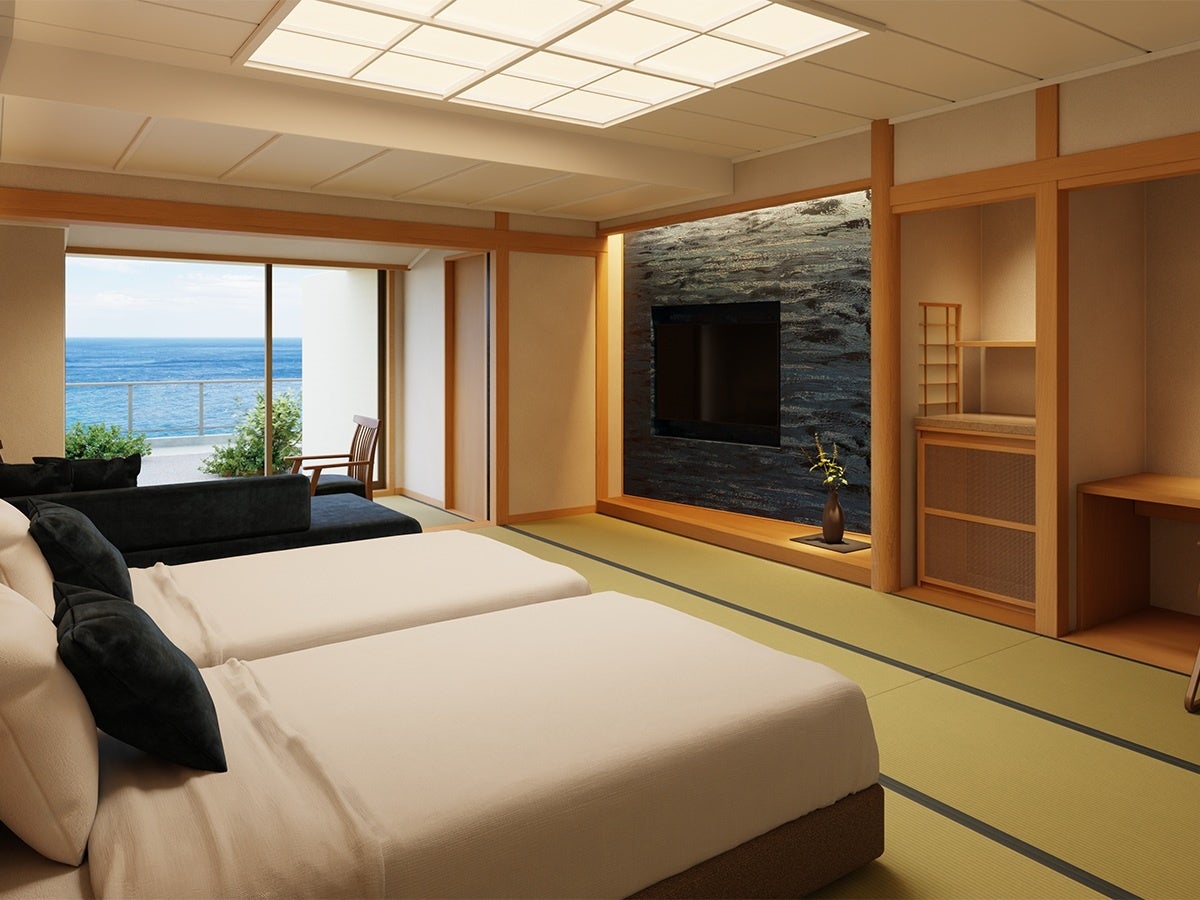 露天風呂とテラスを備えた、約87㎡のモデレートルーム。素足に心地よい畳敷きの空間で、潮風を感じながらくつろぐひとときを。 カップルやご友人との滞在はもちろん、一人で静かに過ごしたいときにも心地よい客室です。