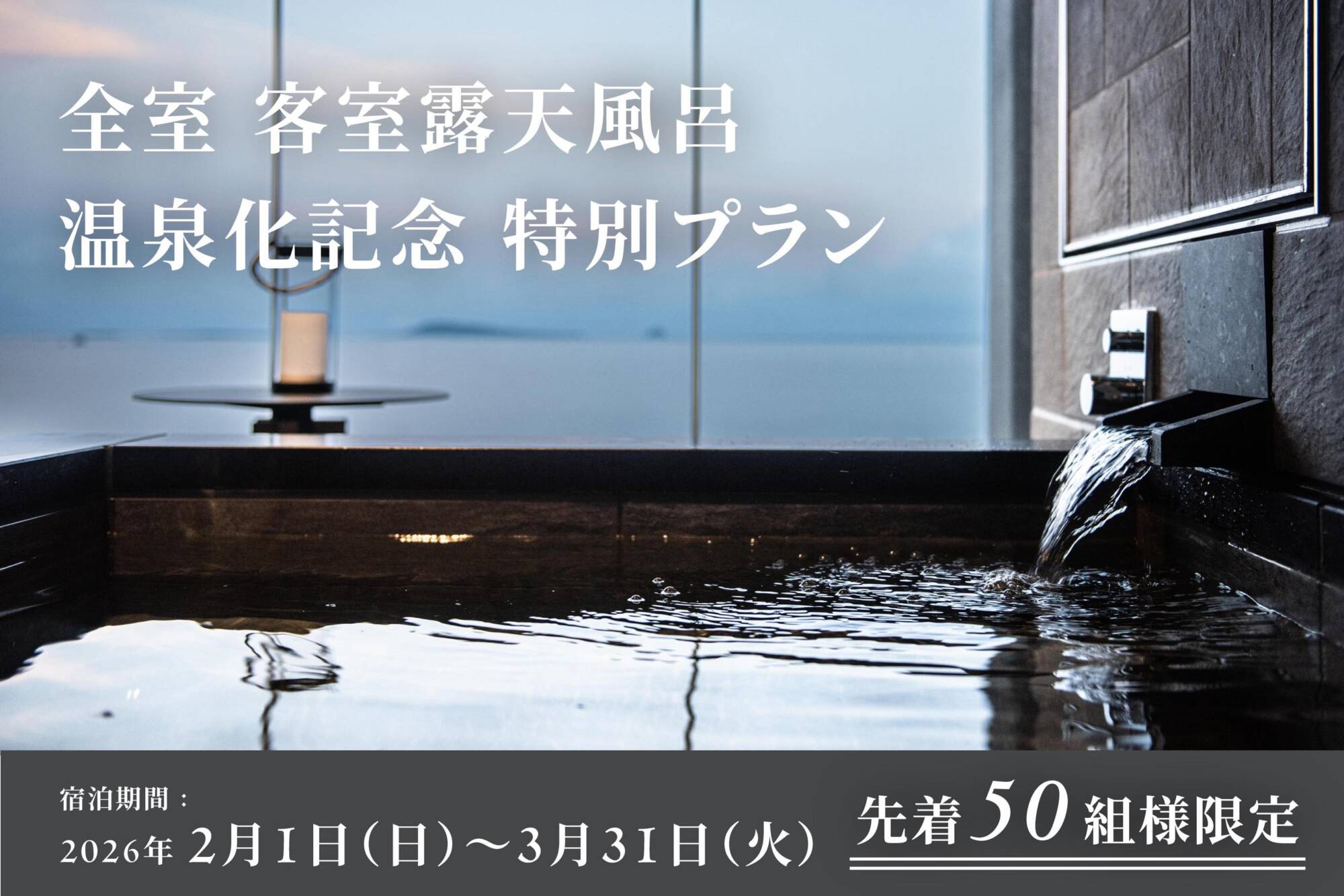 2026年2月1日(日)より、全室客室露天風呂が温泉化となることを記念し、先着50組様限定で、特別プランを販売いたします。