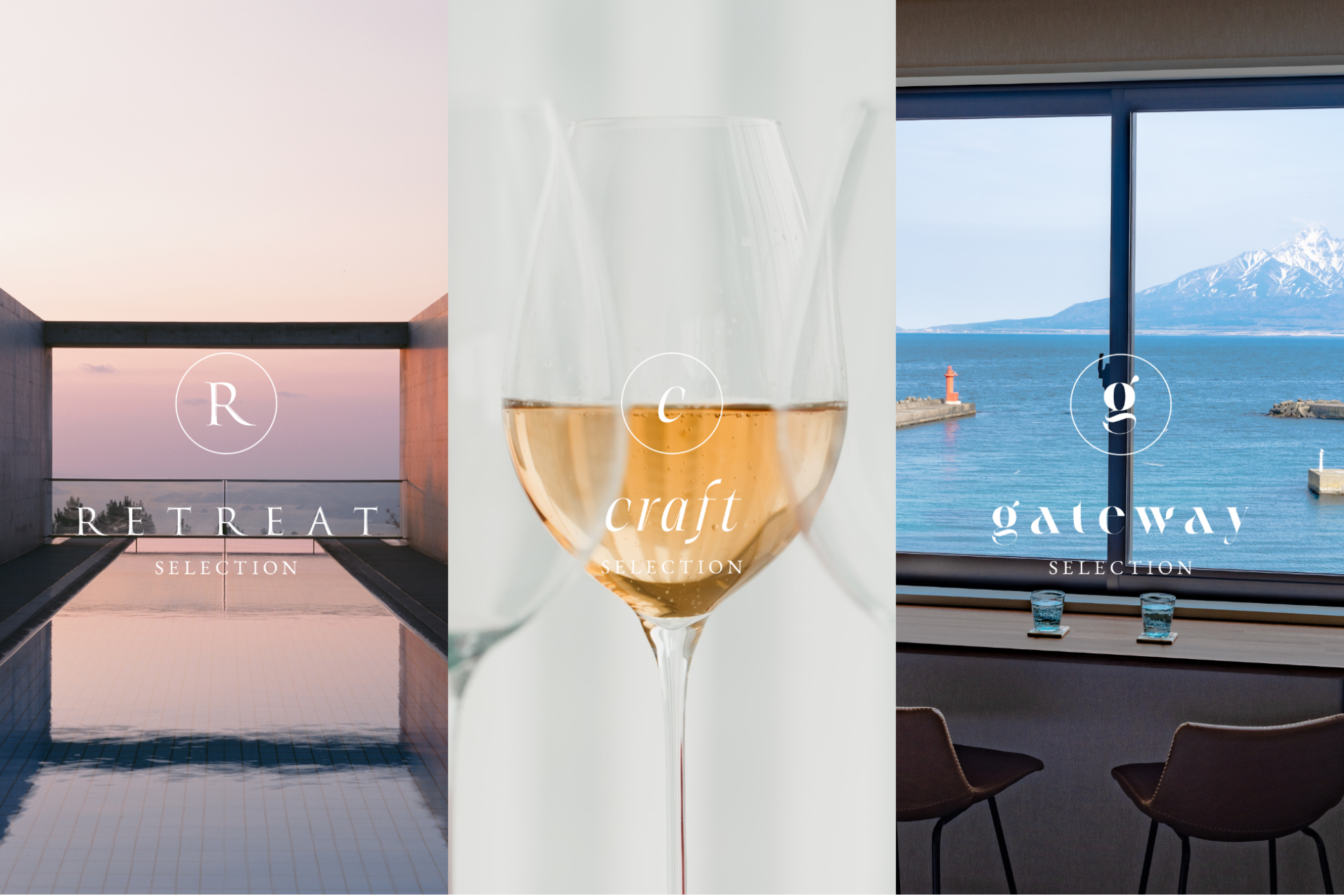 リトリートセレクションは、空間美・食・リラクゼーションなど、非日常空間の中で心身のリトリートがかなうホテル。クラフトセレクションは、明確なテーマ性と作り手たちの情熱が息づく、唯一無二の個性派ホテル。ゲートウェイセレクションは、後継者不在の宿を引き継ぐ事業承継モデルをはじめ、地域と共に歩み、日常に寄り添うことを大切にしているホテルです。